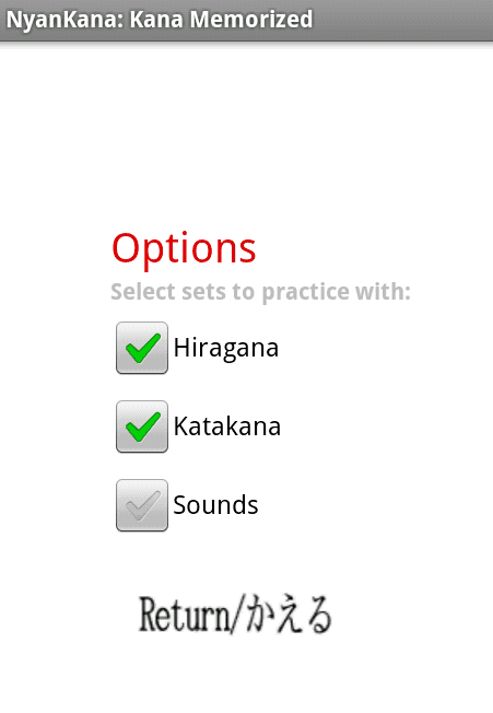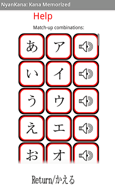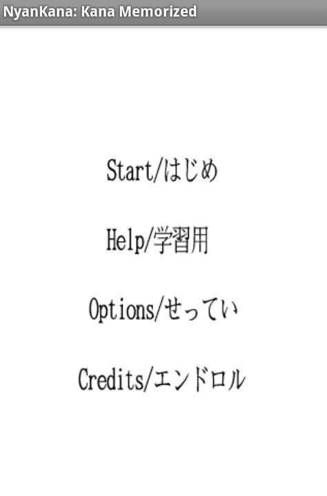 NyanKana: Kana Memorized (or NK:KM for short) is an educational game which aims to help people learn and practice the Japanese kana characters. The kana include hiragana and katakana, whereby the former is used for native Japanese words, and the latter to spell foreign words with. The pronunciation of each character is included as well, in the form of sound samples.